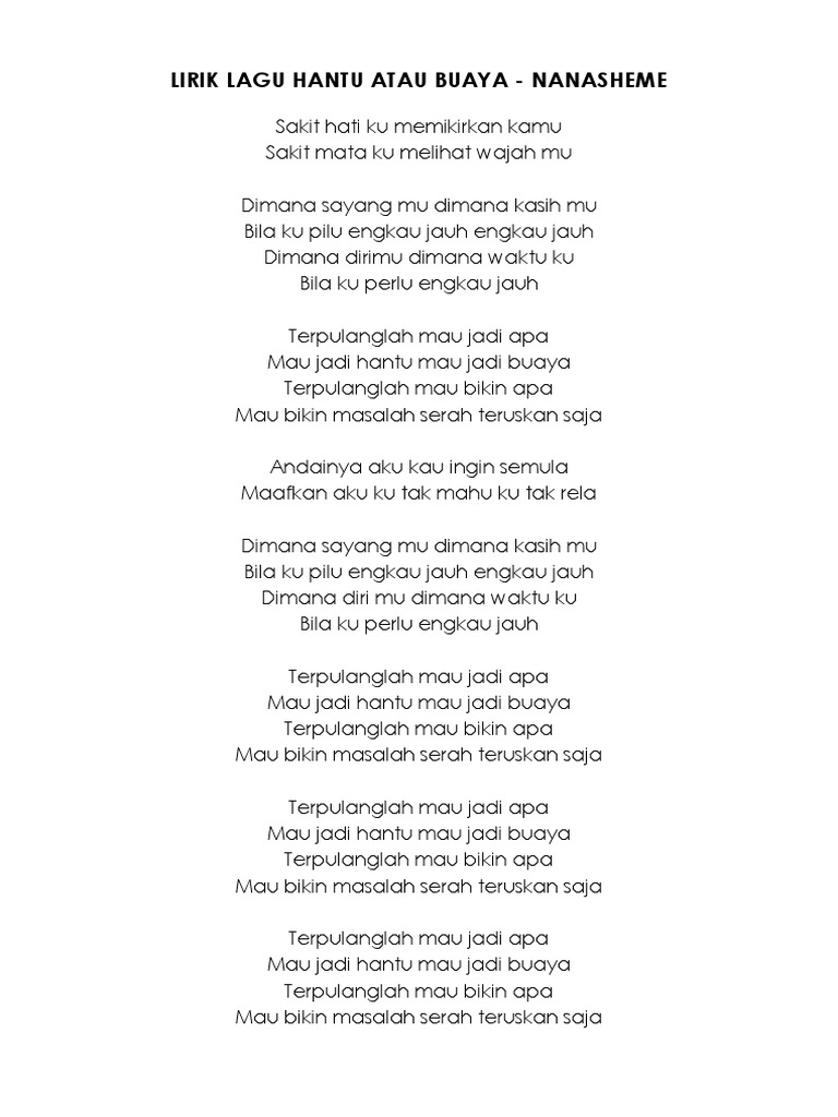 Nana Sheme Download from lh5.googleusercontent.com Lirik lagu hantu atau buaya nana sheme. Terpulanglah mau jadi apa mau jadi hantu mau jadi buaya terpulanglah mau bikin apa mau bikin masalah serah teruskan saja. Untuk melihat detail lagu hantu atau buaya klik salah satu judul yang cocok, kemudian untuk link download hantu atau buaya ada di halaman berikutnya. Terpulanglah mau jadi apa mau jadi hantu mau jadi buaya terpulanglah mau bikin apa mau bikin masalah serah teruskan saja. Bila ku perlu engkau jauh terpulanglah, mau jadi apa mau jadi hantu, mau jadi buaya terpulanglah, mau bikin apa mau bikin masalah, serah teruskan saja andainya aku, kau ingin semula maafkan aku, ku tak mau, ku tak rela. Di mana sayangmu di mana kasihmu bilaku pilu engkau jauh terpulanglah mau jadi apa mau jadi hantu mau jadi buaya terpulanglah mau bikin apa mau bikin masalah serah teruskan saja terpulanglah mau jadi. Berikut cuplikan syair nyanyian / teks lagunya sakit hatiku memikirkan kamu sakit mataku melihat wajahmu dimana sayangmu, dimana kasihmu. Meh diak barang meh diak, nuan ka nyadi nama nuan ka nyadi antu, nuan ka nyadi buaya.
