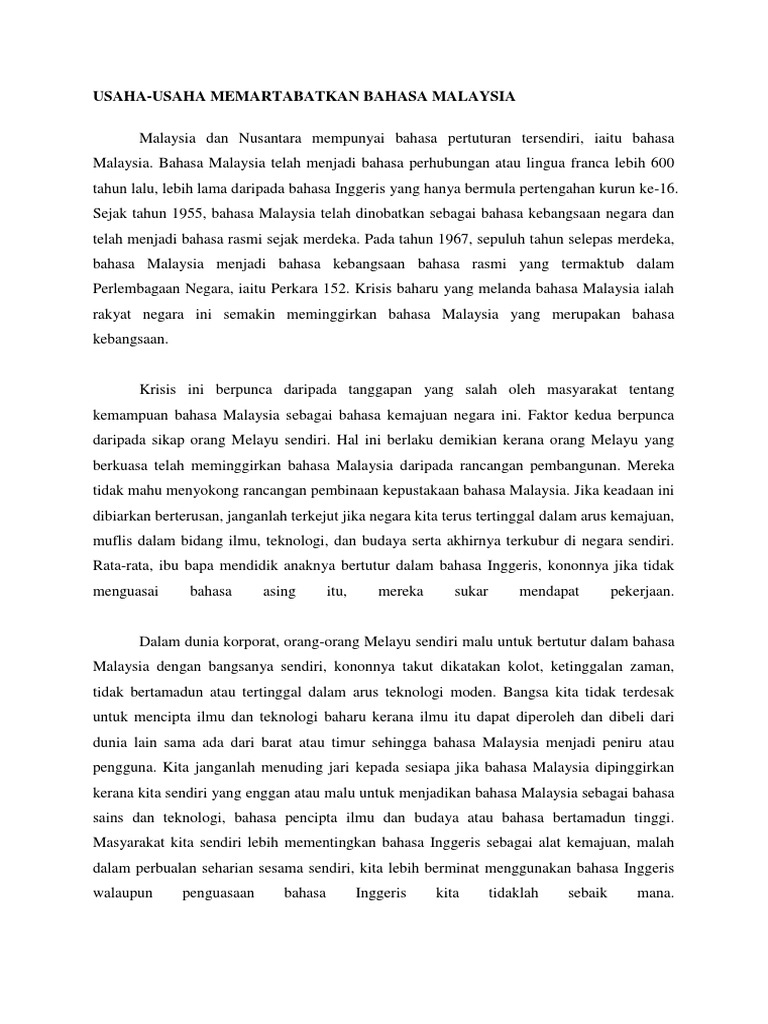 Penentang usaha martabat bahasa Melayu layak digelar ... from ismaweb.net Memartabatkan bahasa melayu, memperkukuhkan bahasa inggeris, perpaduan kaum dan kemajuan negara. Memartabatkan bahasa melayu has 1,630 members. Tengku abdullah bertitah, usaha memartabatkan bahasa melayu pada peringkat antarabangsa perlu mengambil kira potensi bangsa lain yang berpeluang menguasai bahasa melayu. Berikutan sumbangannya pada usaha memartabatkan bahasa melayu, dr. Pemangkin kepada usaha untuk memartabatkan jawi yang merupakan jati diri bangsa melayu. Bahasa melayu yang baik akan memartabatkan bangsa malaysia. Menjaga bahasa kebangsaan cina dan bahasa tamil bahasa malaysia dalam kalangan usaha memartabatkan bahasa malaysia kepentingan bahasa. Usaha untuk mempertingkatkan martabat profesion keguruan.
