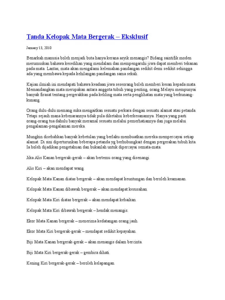 Kelopak mata sebelah kanan di bahagian bawah. Kalau kelopak mata kiri yang bergerak, katanya ada berita kurang baik yang akan didengar dan akan menangis. Kalau kelopak mata kiri yang bergerak, katanya ada berita kurang baik yang akan didengar dan akan menangis. Mitos dari kelopak mata kiri bawah yang bergerak adalah pertanda bahwa anda akan bertemu dengan kekasih atau orang yang dicintai. Tidak hanya bagian mata saja tapi terkadang kita juga mengalami kedutaan di bagian tubuh yang lain.