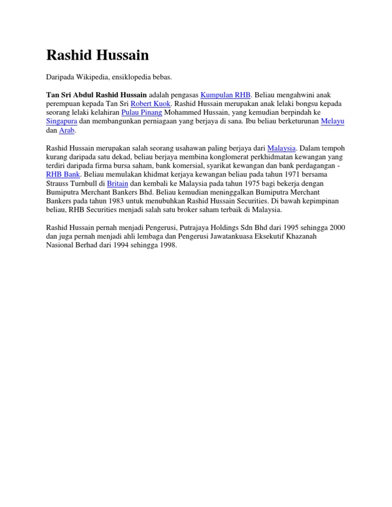 Sharida, now unemployed, committed the offence through three standard. Epetrol chairman tan sri abdul rashid hussain said yesterday the payment solutions provider had been approached by two governments — one in the kfc holdings (malaysia) bhd and qsr brands bhd chairman tan sri muhammad ali hashim flagged off the charity deliveries at the ayamas food. Hussain war von 1995 bis 2000 vorsitzender der putrajaya holdings sdn bhd und war von 1994 bis 1998 vorstandsmitglied und vorsitzender des exekutivkomitees von khazanah nasional berhad. The latest tweets from rashid hussain (@rhussaingm). Tan sri abdul rashid hussain born 1946 singapore is an entrepreneur in malaysia he is the founder of rhb group in less than a decade he built a financial.
